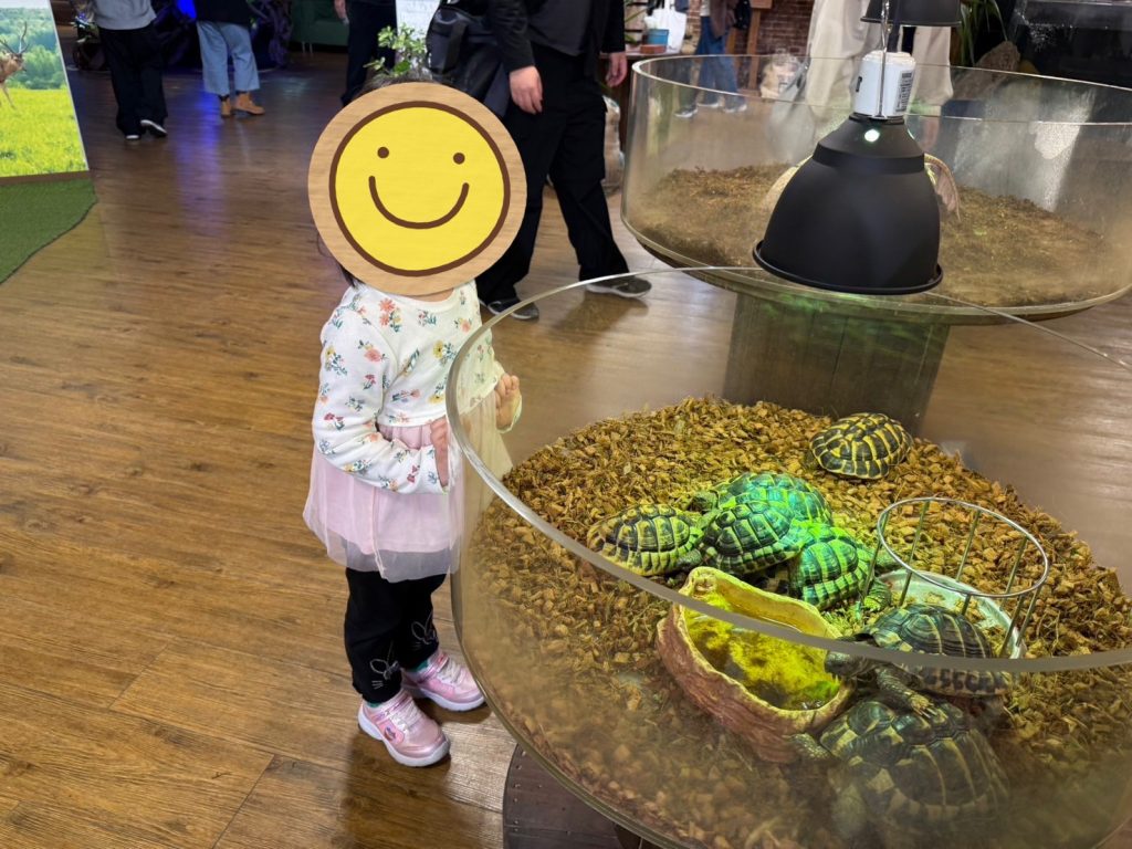 のそのそコーナーではカメレオンや亀を実際に触れるコーナーがあり、子どもたちは怖がることなく